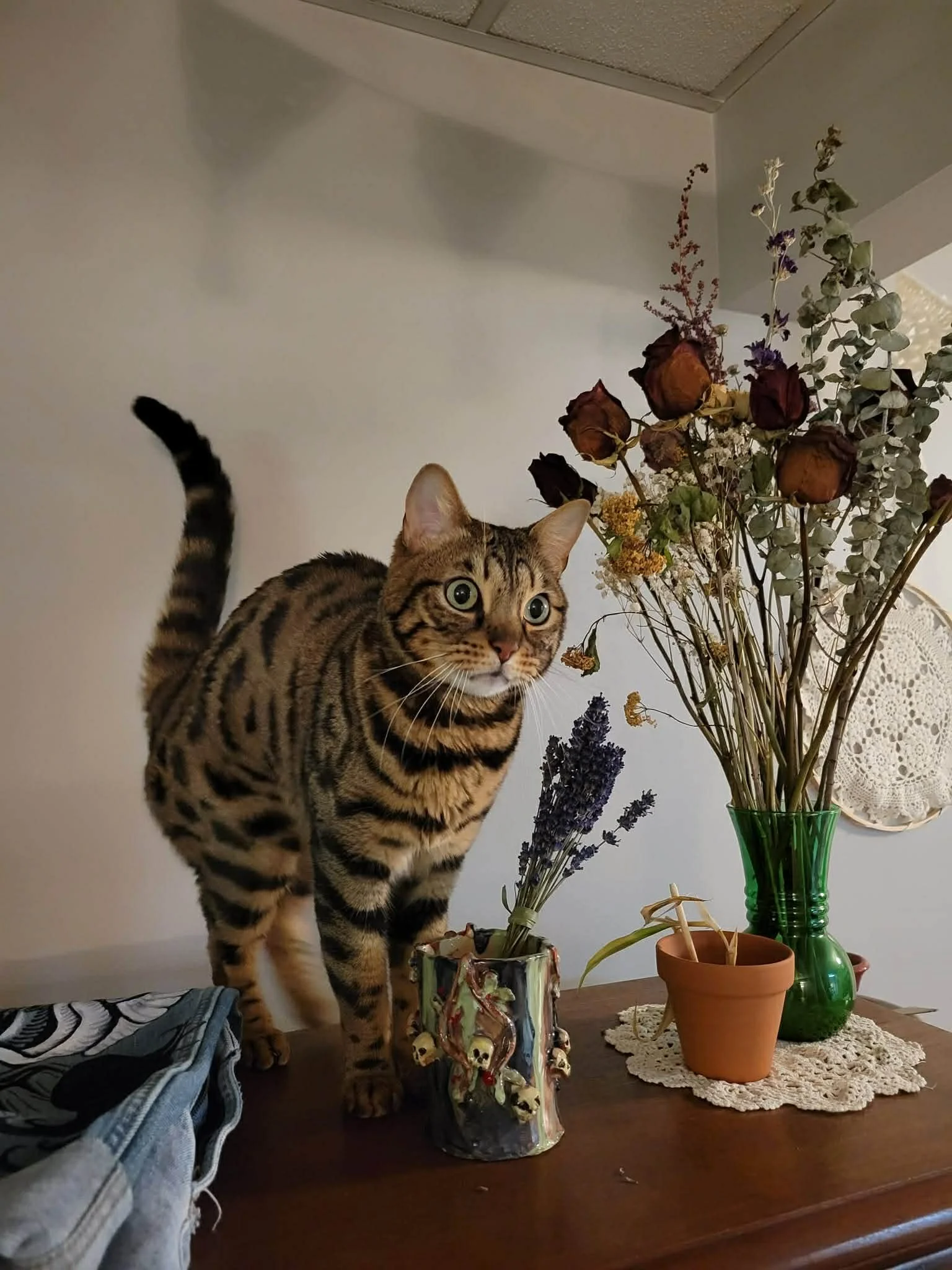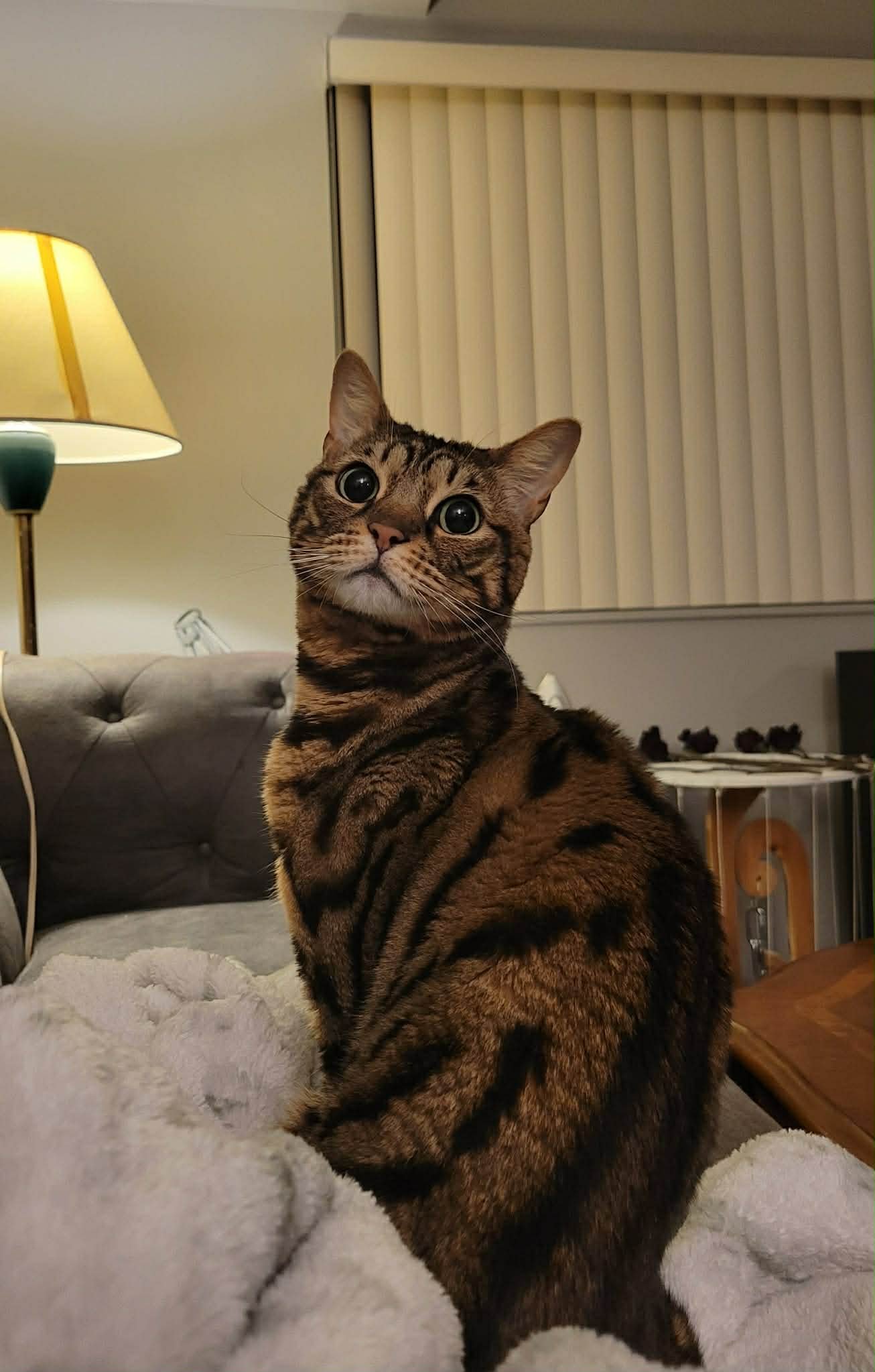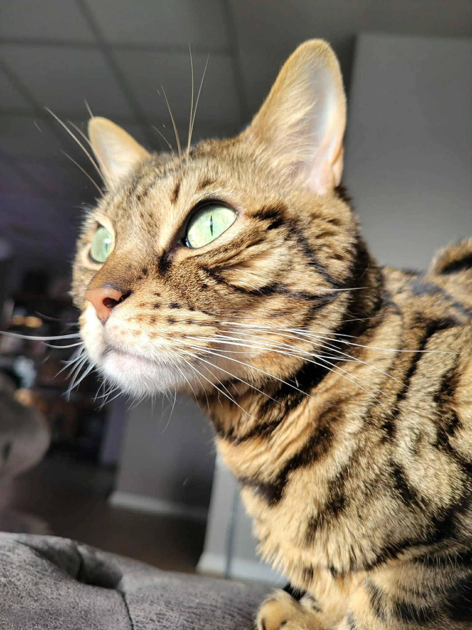 Amara is a very chatty and adventurous bengal kitty who, on her own terms, can become quite a snuggly girl. She loves chin scratches and climbing to high places. You can often find her checking the acoustics of the house by hollering in the hallways, or attempting to explore the top cupboards in the kitchen. She sees closed doors as a test to her gymnastic ability, and would likely enjoy a home with a catio, or a safe and enclosed backyard.