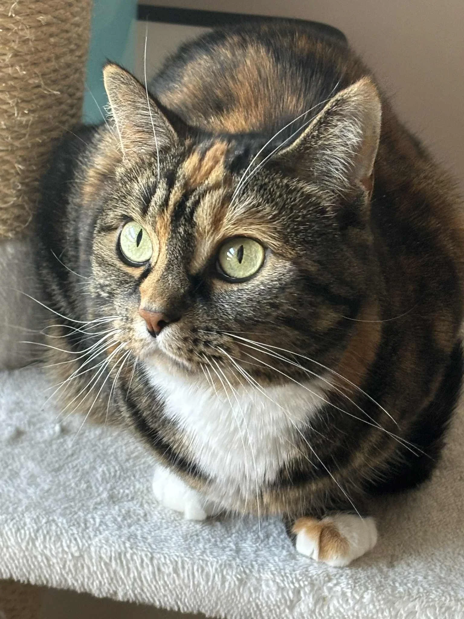 She has the most beautiful multicoloured torbie coat and is very soft and silky. She shows off shades of orange, tabby, and a little white patch on her chest. Her toes are multicoloured with little white socks.