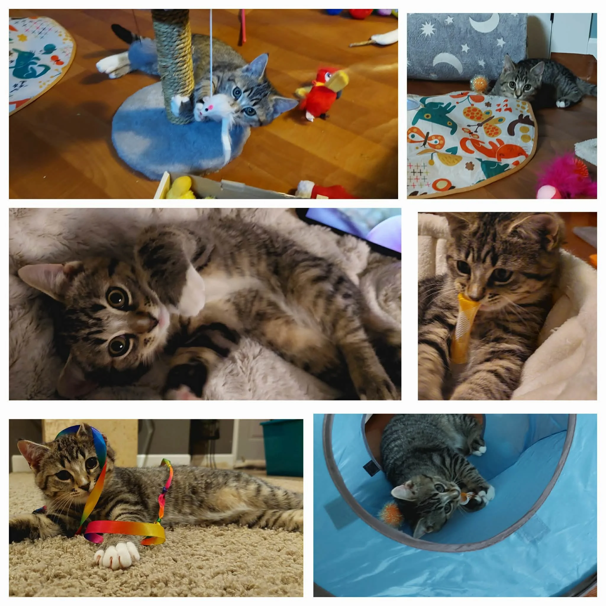 He loves to play with wands, cubes, tunnels, fuzzy mice toys, fuzzy balls and to chase the red lazer beam light. He absolutely loves his tall scratch post to play and sleep on. He also has a favourite mouse toy that rattles that I will send with him to his furever home. He loves any toy that rattles.