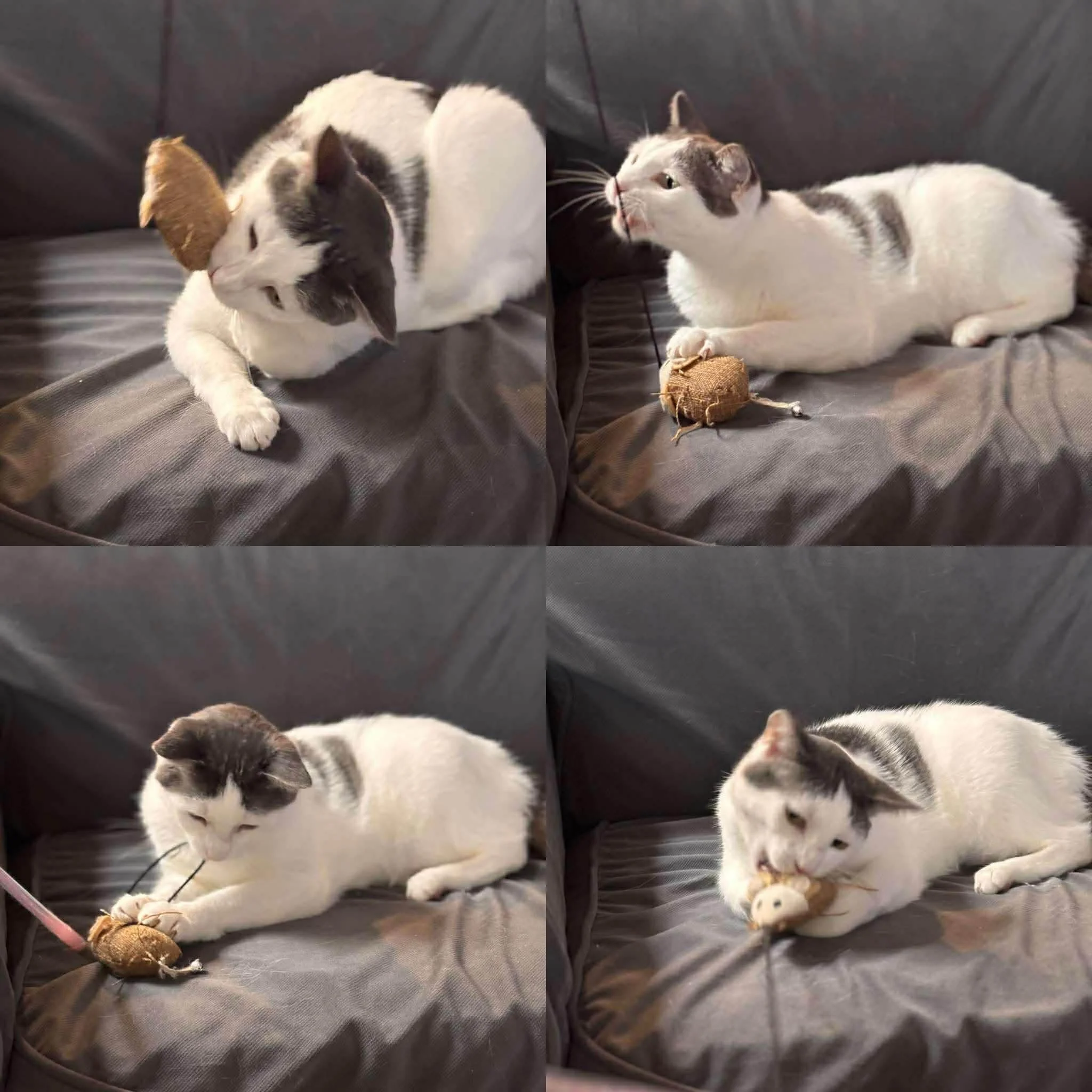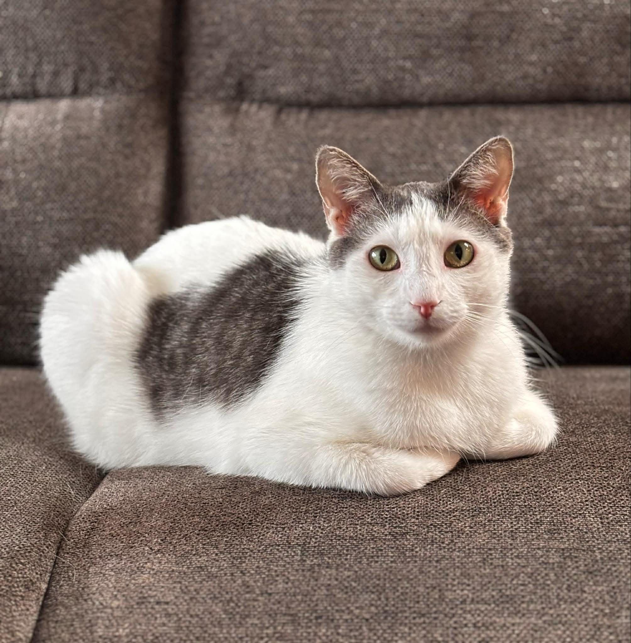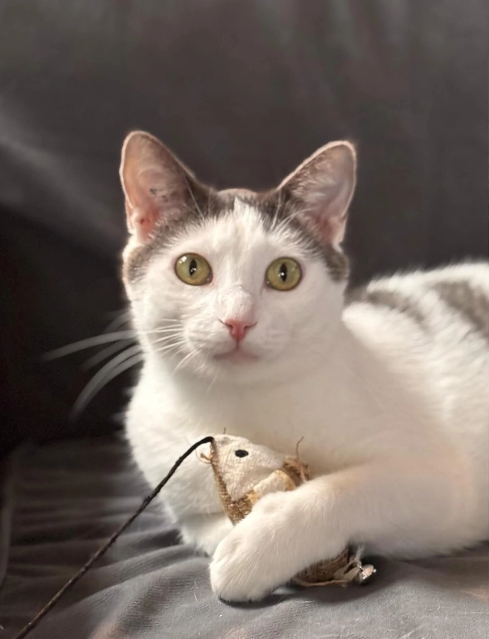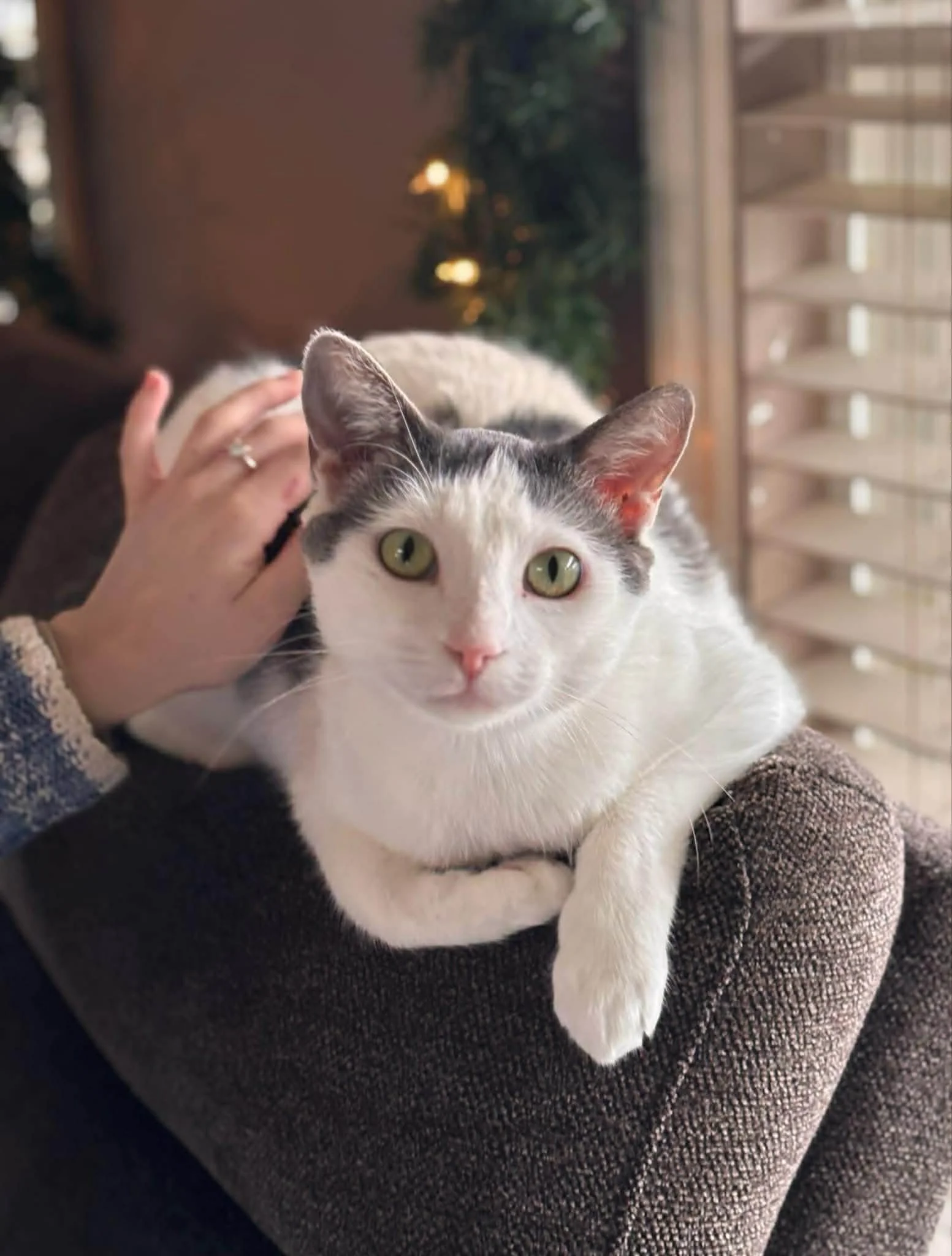 Sweet Elizabeth is such a lovingly affectionate, playful and independent girl. She just wants a chest or a lap to cuddle on or a perch nearby that she can watch you. She is very playful and loves chasing after anything on a string. Elizabeth is such a sweet girl that has had babies and now needs a soft landing after a not so great beginning. Elizabeth likes to use her mouth and paws to play with your hands, but she is getting much better at stopping when you stop and say no. Elizabeth needs a slow introduction to calm friendly cats and would rather coexist than play. She is tolerant of our small dog, but is not a fan of our large dogs. Elizabeth eats well and is litter box trained with no issues. She has such a charming face that draws you in to give her nonstop love and cuddles. Her quiet, loving temperament will make her such an endearing addition to a very lucky new person or family!