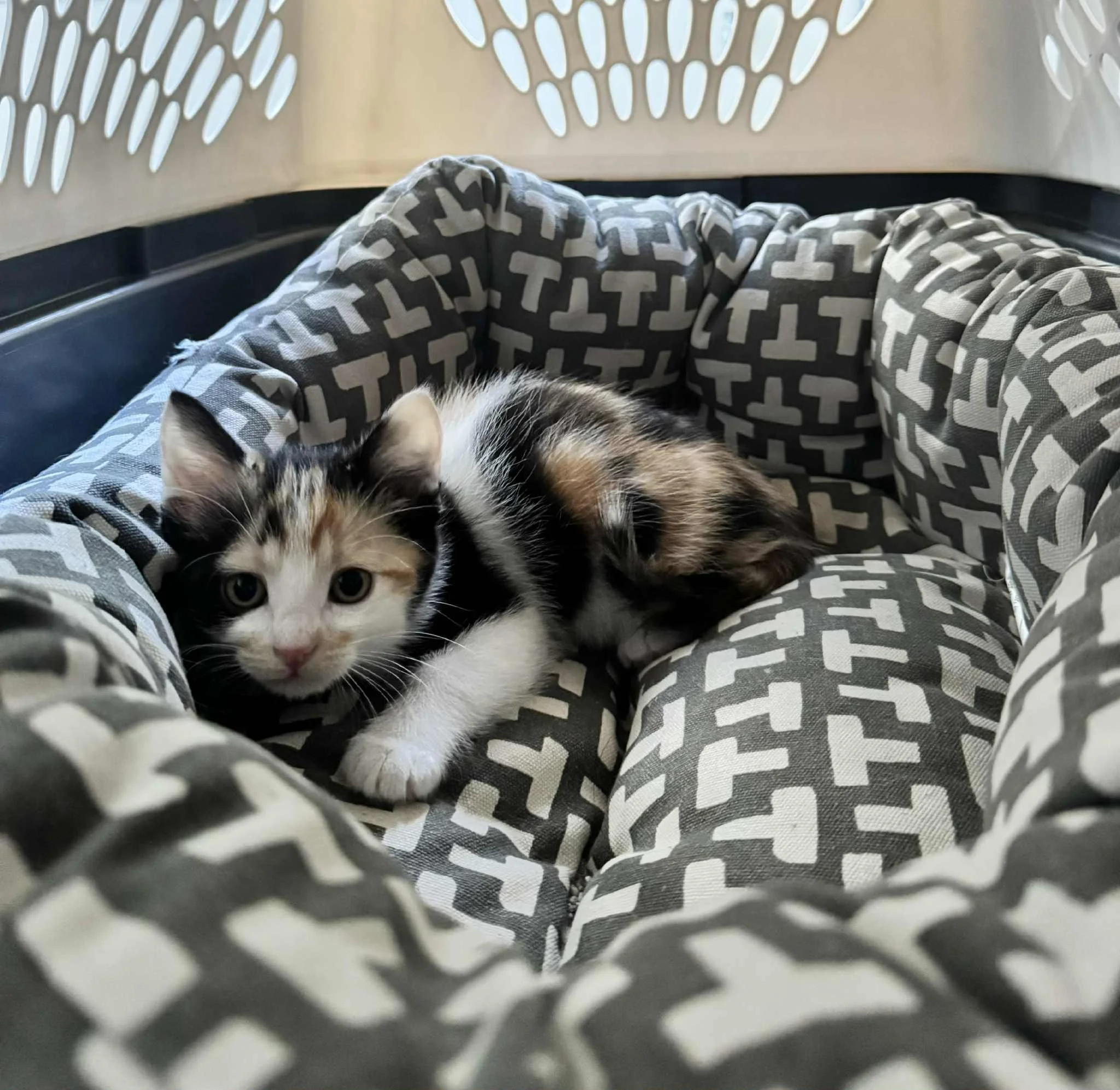 FRIDAY - Meet Friday! She is an 8 week old domestic short hair with a beautiful calico coat. This crazy little girl is full of spunk and loves to play and run around. When play time is over she is happy to lay in a blanket curled up beside you. She would be good with dogs, cats and kids! She is fully litter trained and is eating wet and dry food.