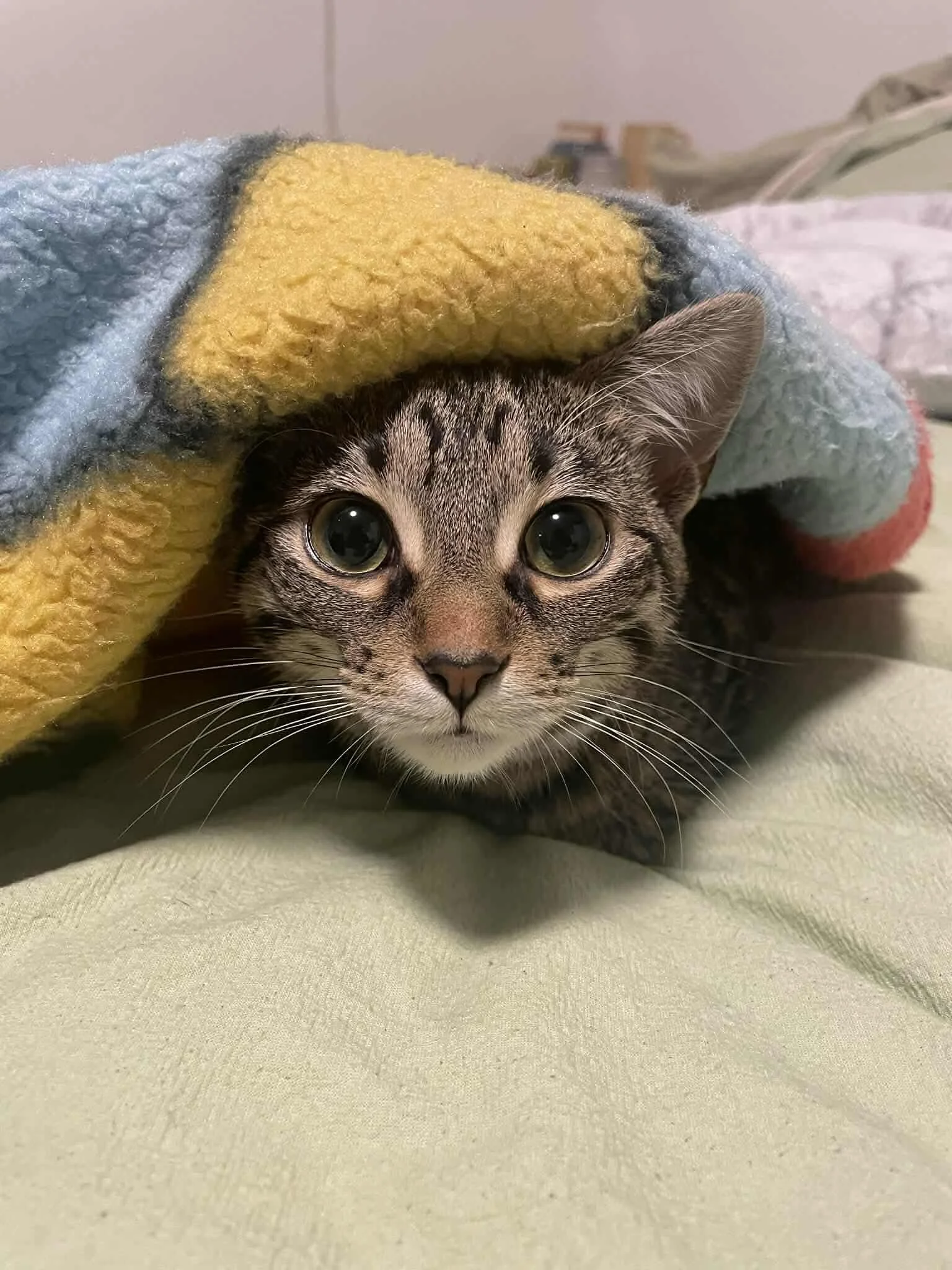 Harriet is a shy-at-first sweetheart with a big, rumbly purr hiding just under the surface. Chin scratches are her love language, once she trusts you, she’ll melt right into your arms. As she gets comfortable, her playful, adventurous side comes out, expect zoomies, exploring and kitten mischief, especially when things are quiet.