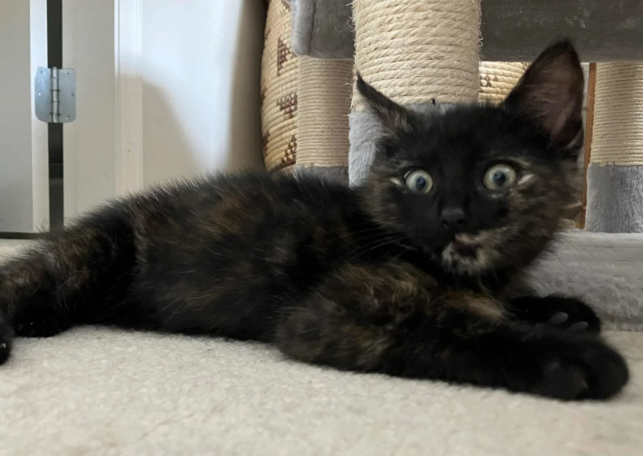 Don't let her appearance fool you: because of the white marks at her eyes she looks as if she just got a huge fright! Not so! A fun loving, playful, born escape artist, and fast! She loves getting herself into small, dark spaces, only to emerge victoriously on the other side while the silly human is still looking on this side... And after escaping she would triumphantly and quietly sit down and observe the world…. Very innocent, indeed..! But humans also have a trick up their sleeve to get her attention: Houdini loves her treats, and licking the last wet food off your fingers. Houdini is predicted to become a real snuggle bug in her forever home.