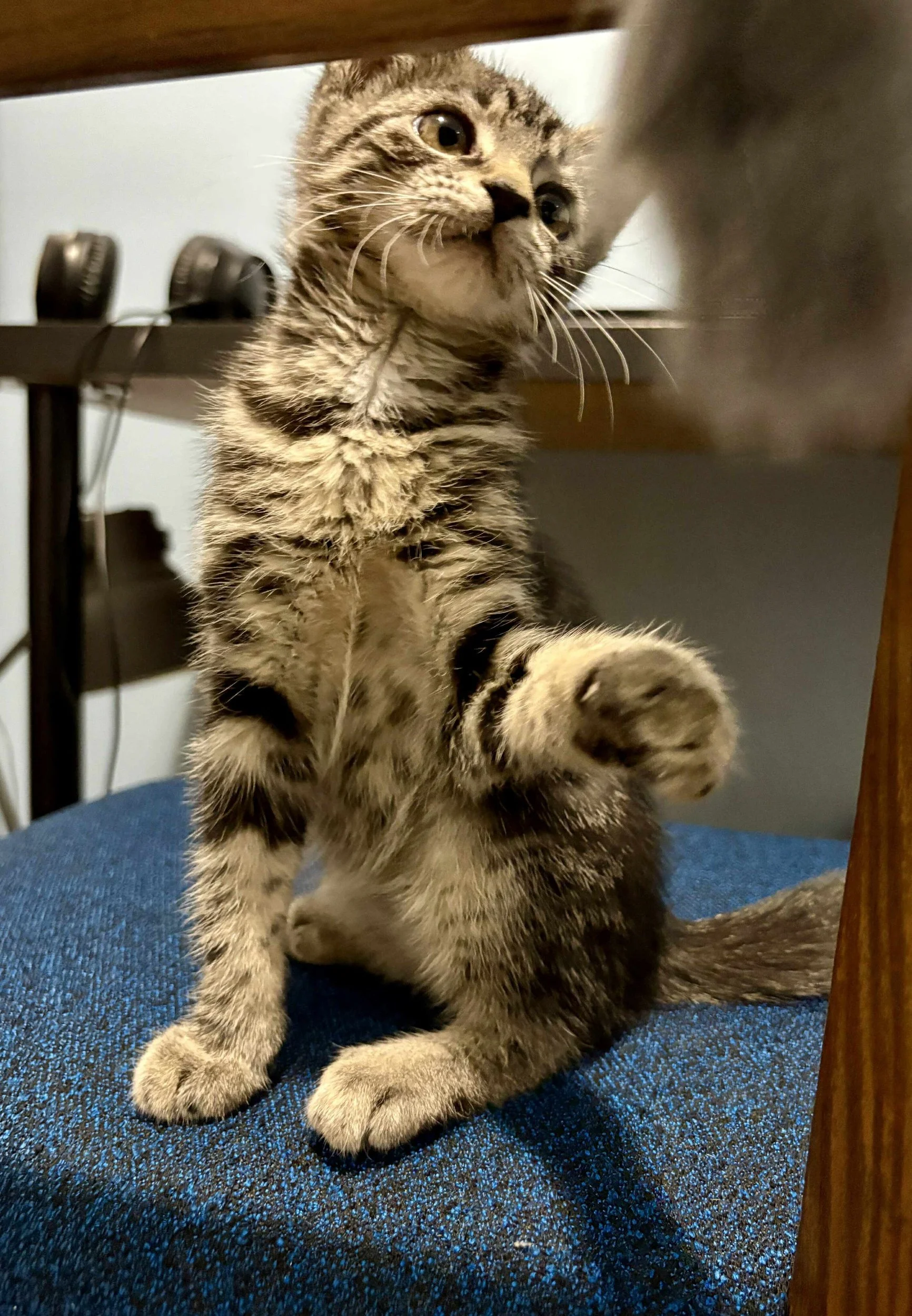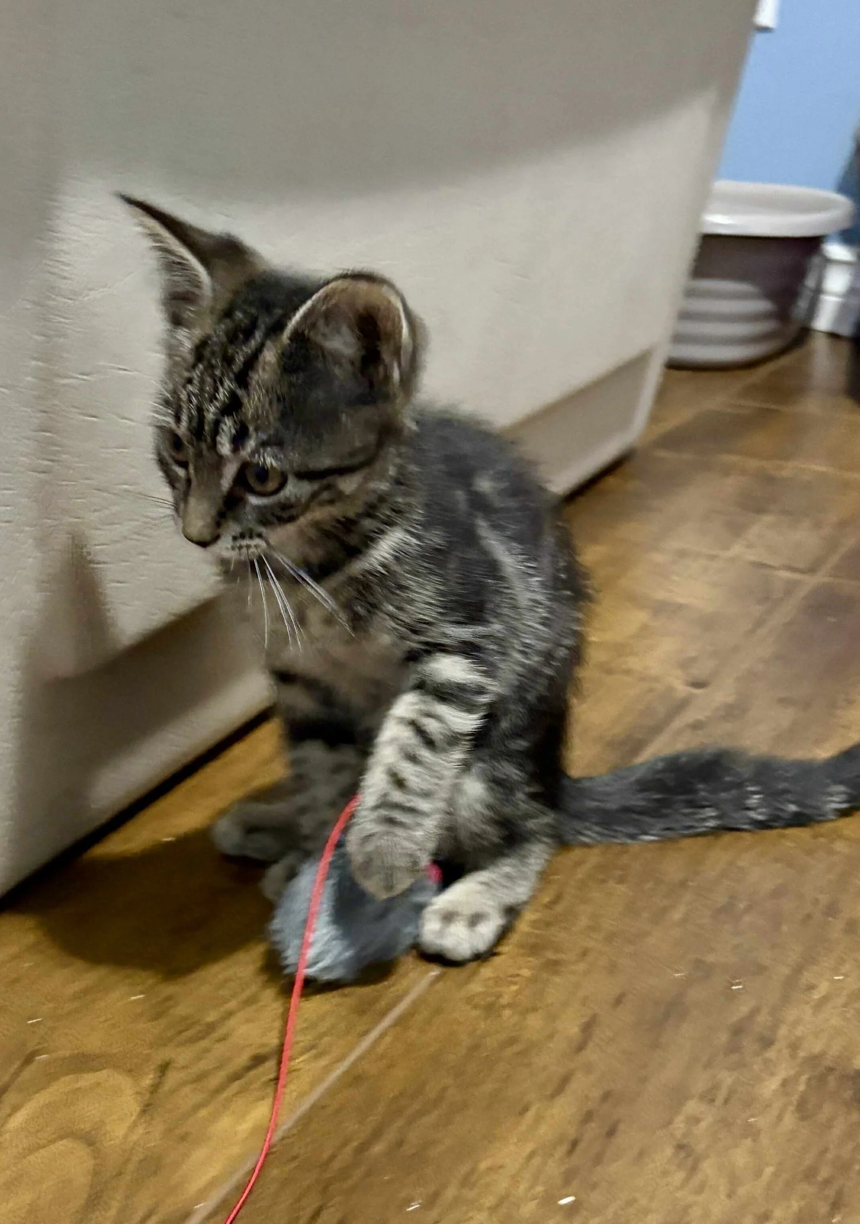 Hunter is a playful and confident kitten. He loves making anything a toy for him to play with. He’s in a home with young kids. He’s very well adjusted to the whole family. We often find him snuggled with our daughter at night. He is in a home with another cat and dog. Our older cat unfortunately does not like his high energy. This doesn’t deter confident hunter. He continues to pursue companionship with her. Our dog is not bothered by having a kitten around. Although Hunter likes to make his presence known to our dog. Hunter will settle on a chair near our dog on his dog bed and rest. Hunter is accepting the presence of a dog. As mentioned he’s a high energy confident kitten. We are never bored with his kitten energy around the house.