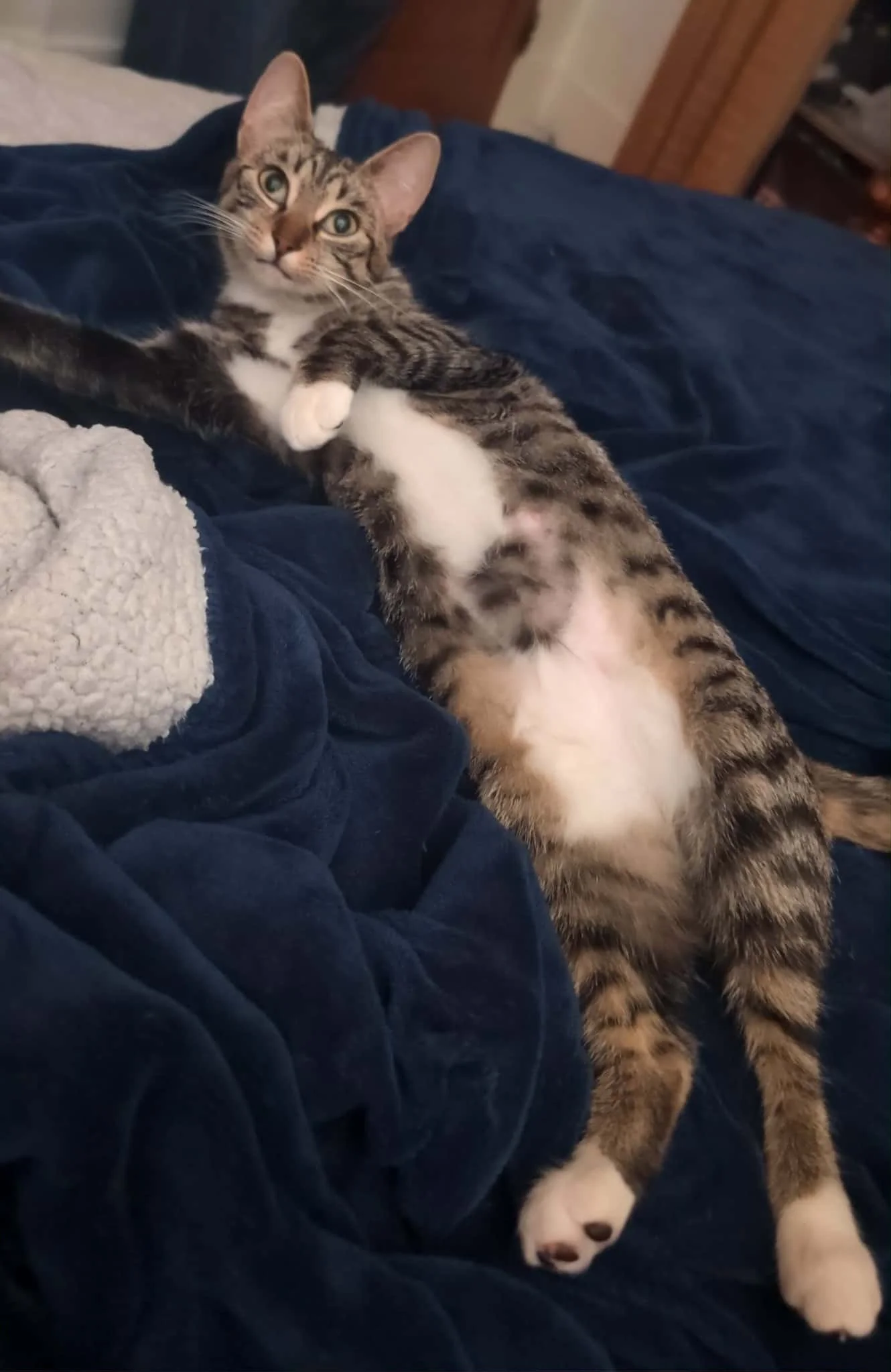 Molly is the best combination of sweet, curious, playful, and feisty! She loves cuddles and attention, however don’t let her small size and cute face fool you- she is a fearless ball of energy. She loves to play with her catnip fish, wand toy, or just about anything else she can get her paws on. She also loves to attack her foster mom’s feet under the covers with her signature bunny kick! Molly has a persistent but adorable meow and can be quite chatty with her humans. After expending her energy she loves to purr and cuddle with her foster human.