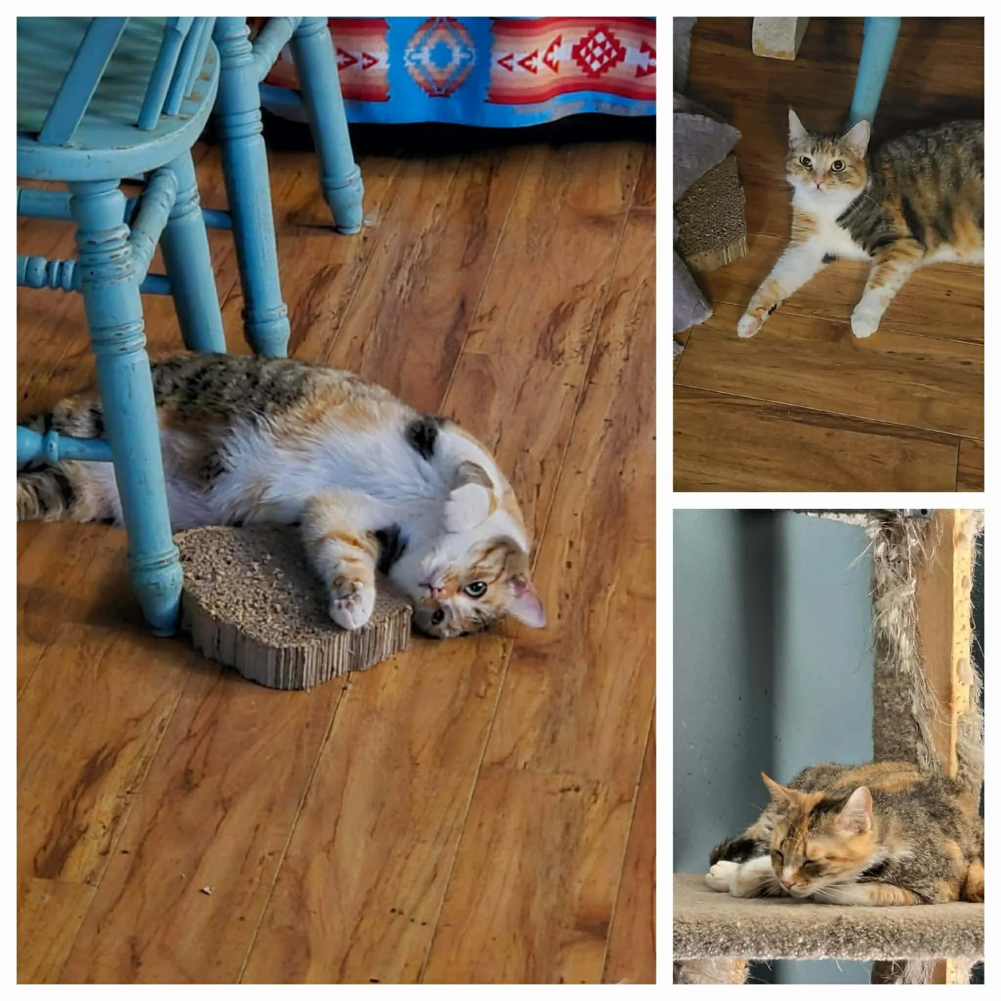 Penny likes calm and quiet cats. The young ones or more dominant ones will chase her, and she will just hide. Penny needs a quiet home where she can just lounge around and contemplate the idea of letting a human touch her. She enjoys playing and stretching out across the sofa. I am confident that Miss Penny will come around in the right environment and will just give her the space she needs. She's really settling with us, and we can walk right past her, and she won't get up and run when you get super close. It's the moment you stay and she gets the hinkling that you might want to touch her and she walks away. Just for enough to watch the disappointment show on our faces. She's a smarty, pretty kitty.
