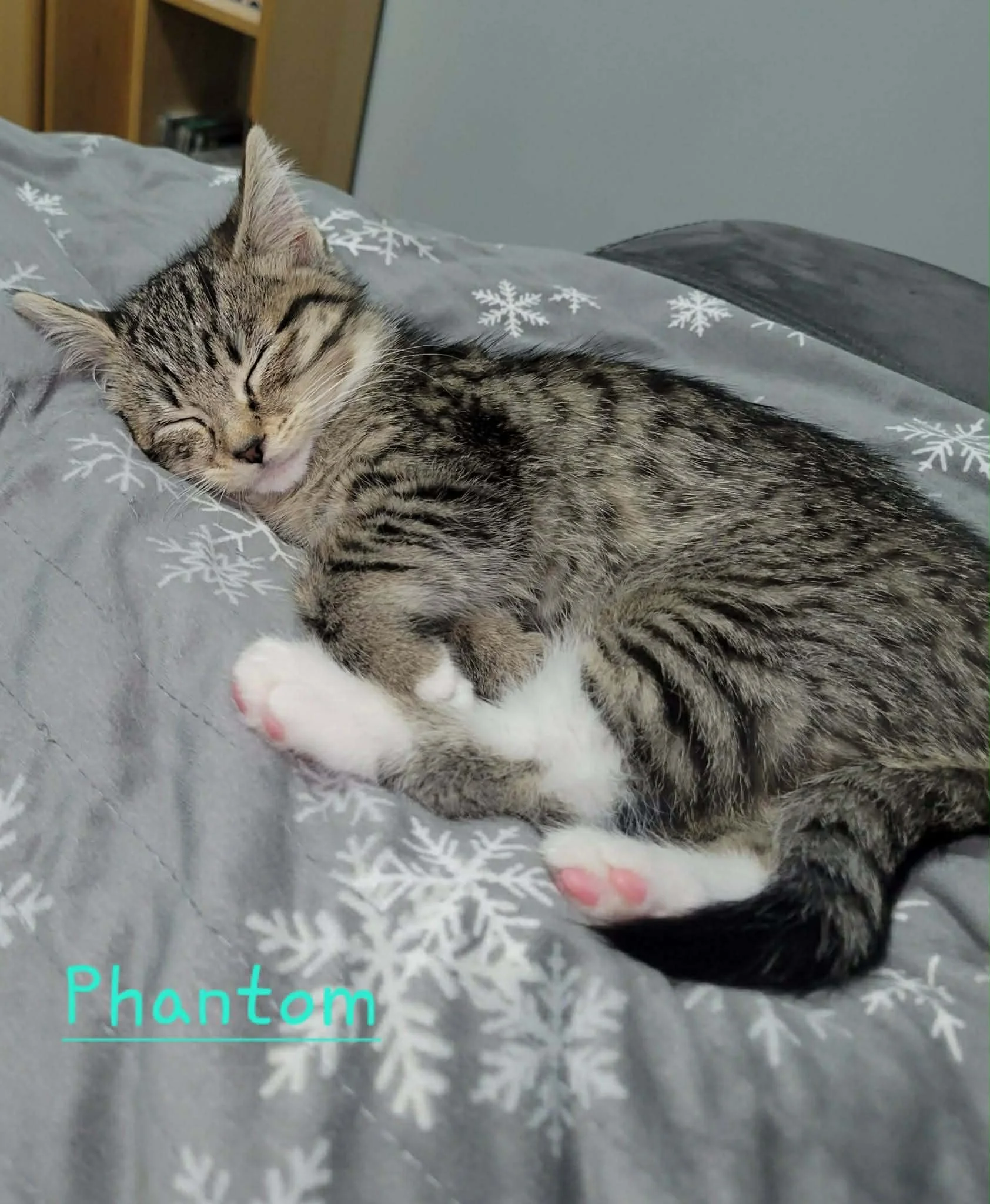 Phantom came into my care at 10 weeks of age with her sister Lace. At first she was very reserved, subdued and shy. After a few days she let her guards down and she soon became an extremely cuddly and affectionate kitten. She loves attention and pets. Hold her tightly to your chest and she will let herself melt into your hands. She will climb onto your lap and settle for a long, purry nap as soon as you sit down to watch tv.