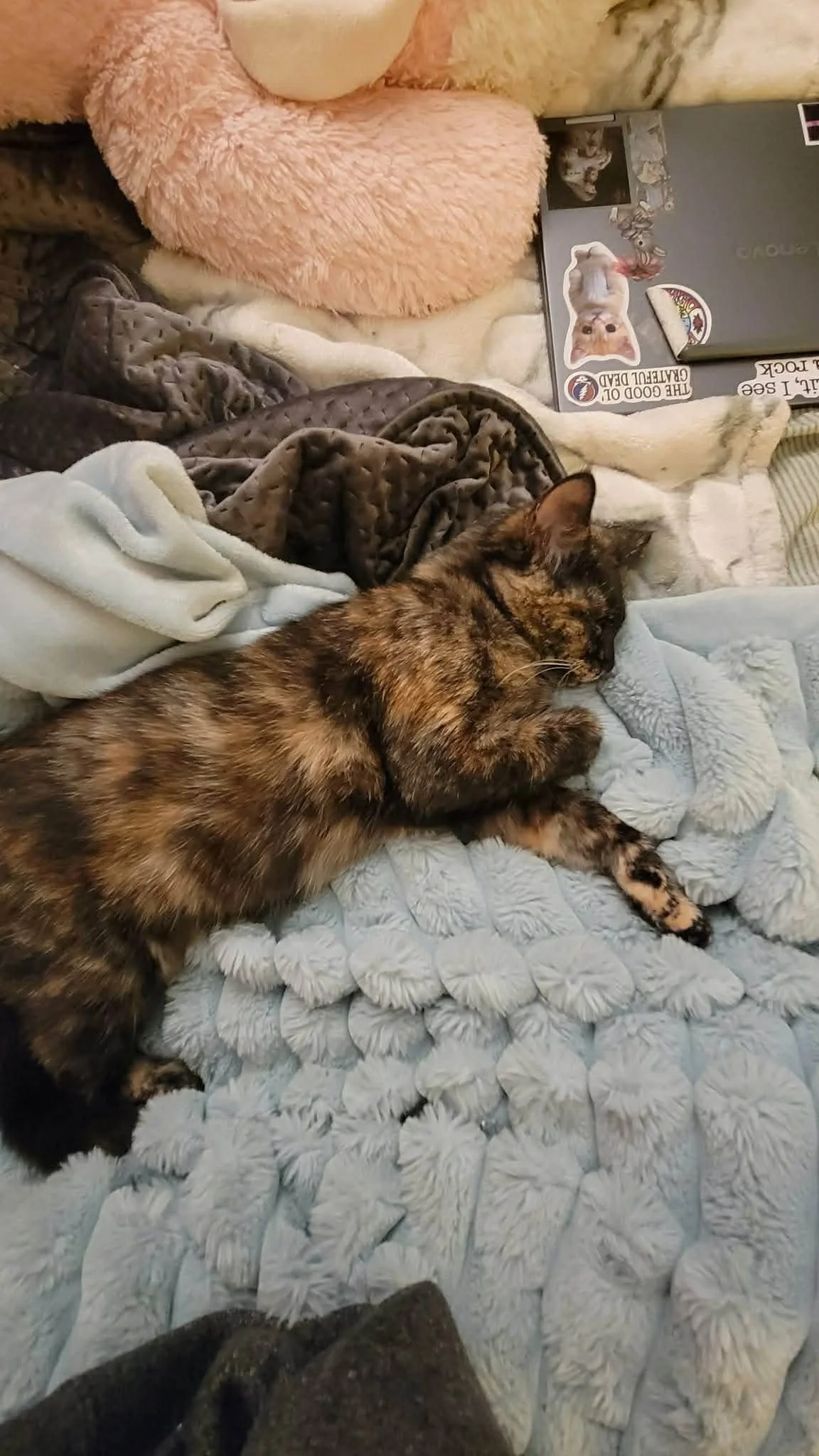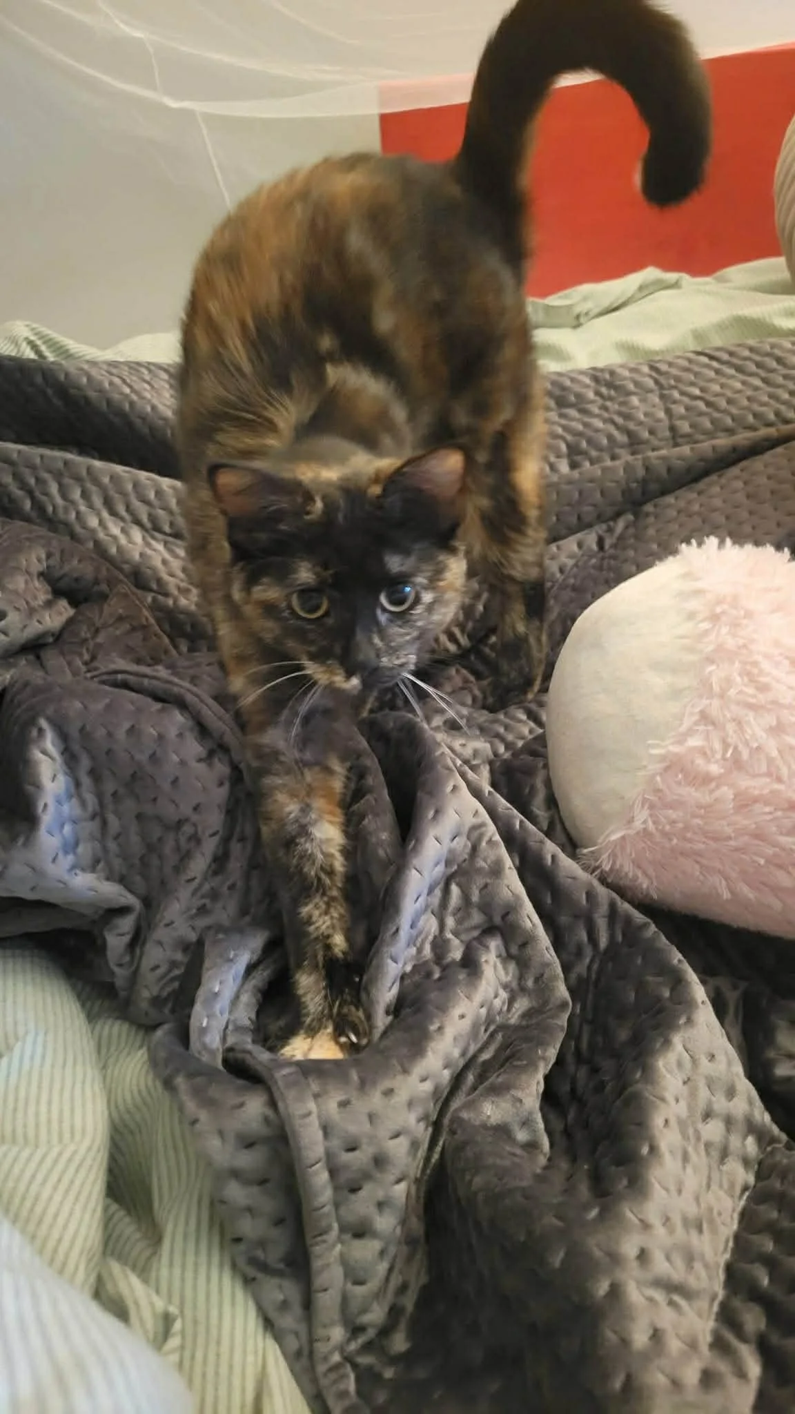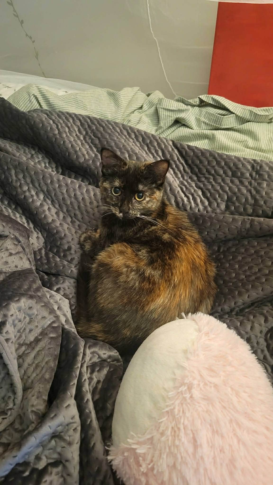She is a very adventurous and curious tortie kitty, always exploring and finding new ways to play. She is not bothered in the slightest by other cats, and tries her best to make friends with her foster siblings. She likes to curl up next to you on the couch or on top of you while you sleep, and she loooves head scratches.