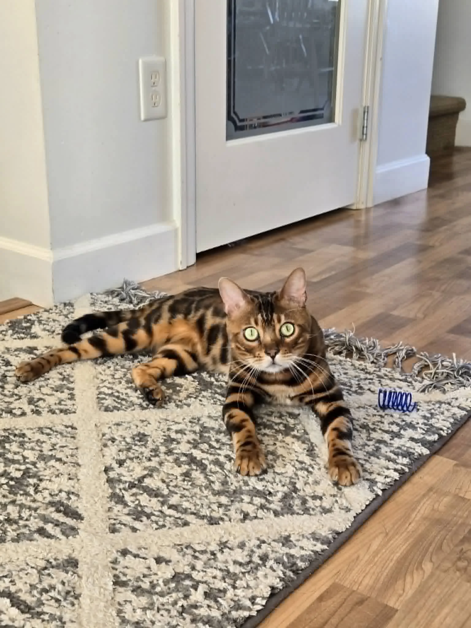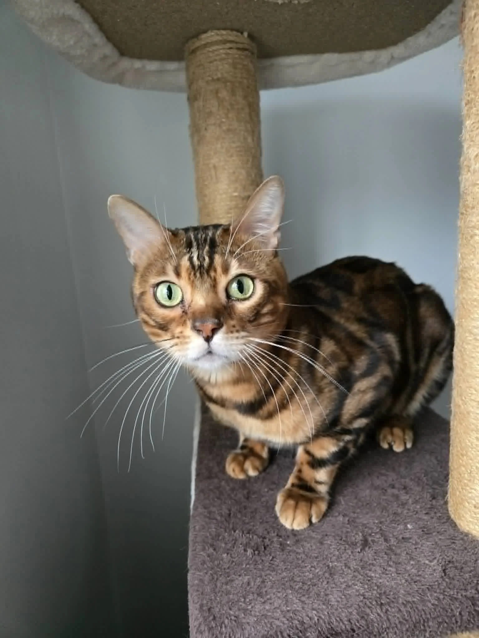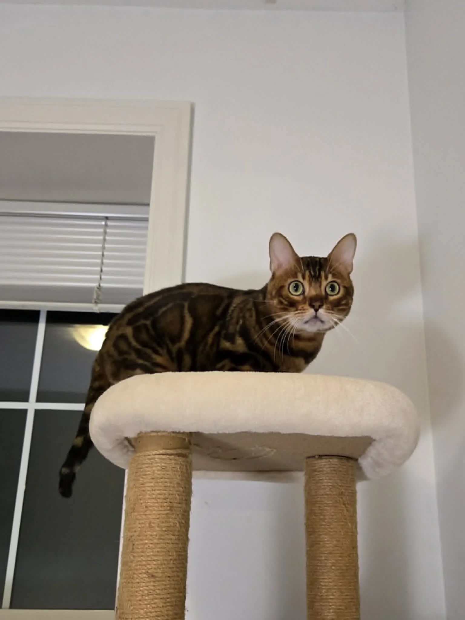 Rocko is a beautiful boy with some classic bengal quirks. He's very chatty, and loves being able to explore everywhere he can. He is very social once he's built trust with both humans and furry friends, but it takes him some time to warm up to both. His love language is wet food until he trusts you, then he can't get enough pets. So far he has not been a snuggly boy. He's very playful, and independent but would do well with someone who has lots of time to be home with him. He needs a quieter home without young kids, but may do well with older kids who know how to move slow and respect his skiddish nature.