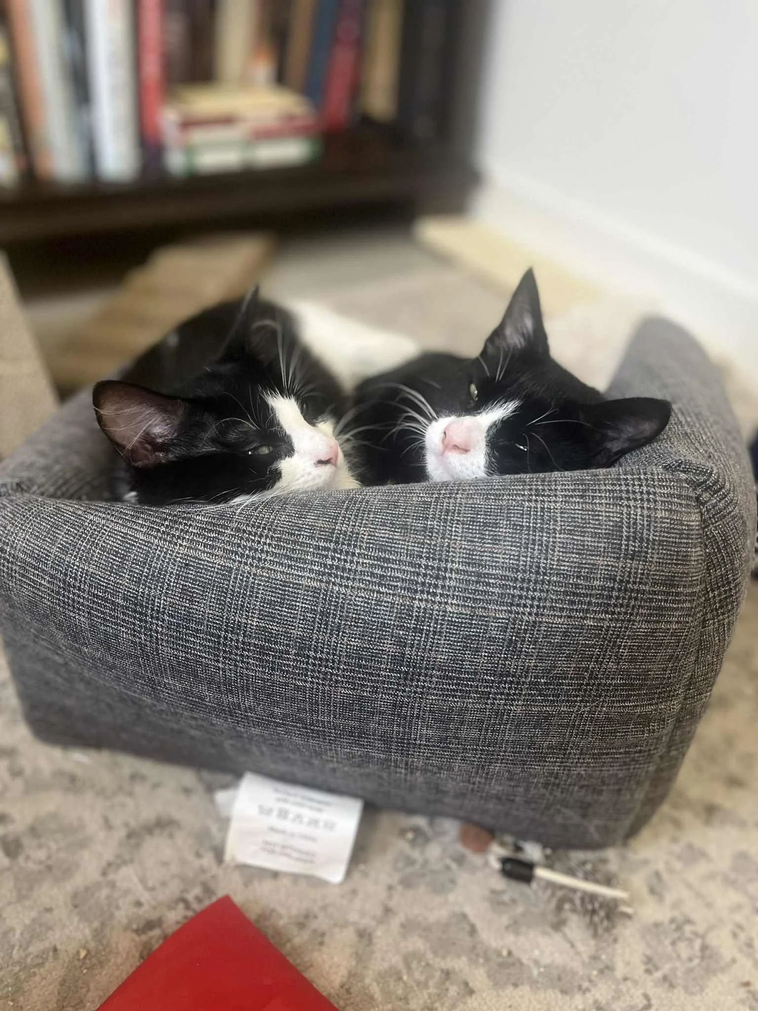 Scratch is the fluffier one of the two. He likes to flop onto his back for belly scratches and enjoys curling up under your legs under a blanket.