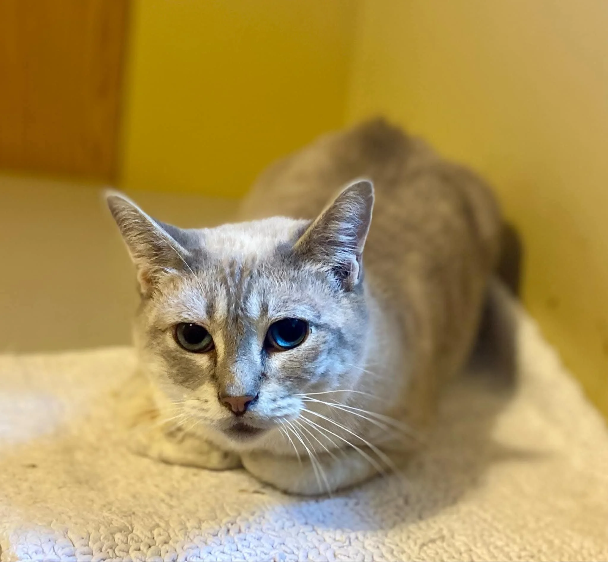 Sissy is a sweet, gentle soul with big, beautiful expressive blue eyes and a soft, creamy and grey coat to match her delicate nature.