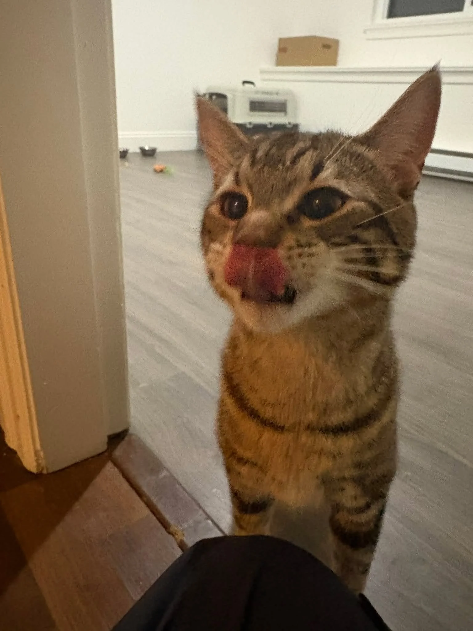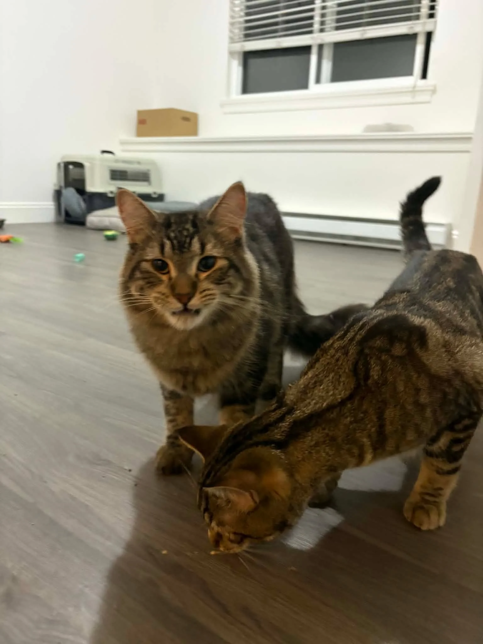 When I first met them, they wouldn’t come out of their carriers until I left the room. By day 3, they started coming out even while I was still there. Now, about a month in, Watt will take a step or two onto my lap for lickable treats, and Ditka has taken his first bite directly from one while I held it for him.