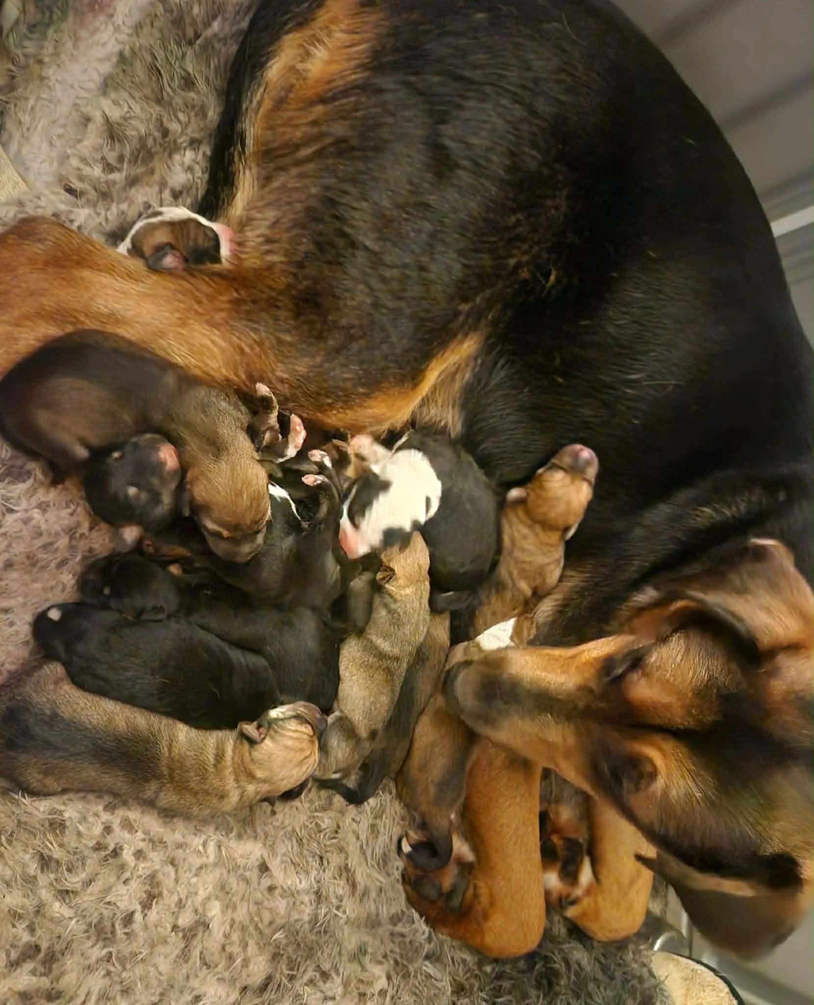 Brandy is an approximately 3-year-old Rottweiler mix with the calm, loving heart of a true nurturer. A devoted mama to 14 puppies, her gentle nature clearly lives on through them.