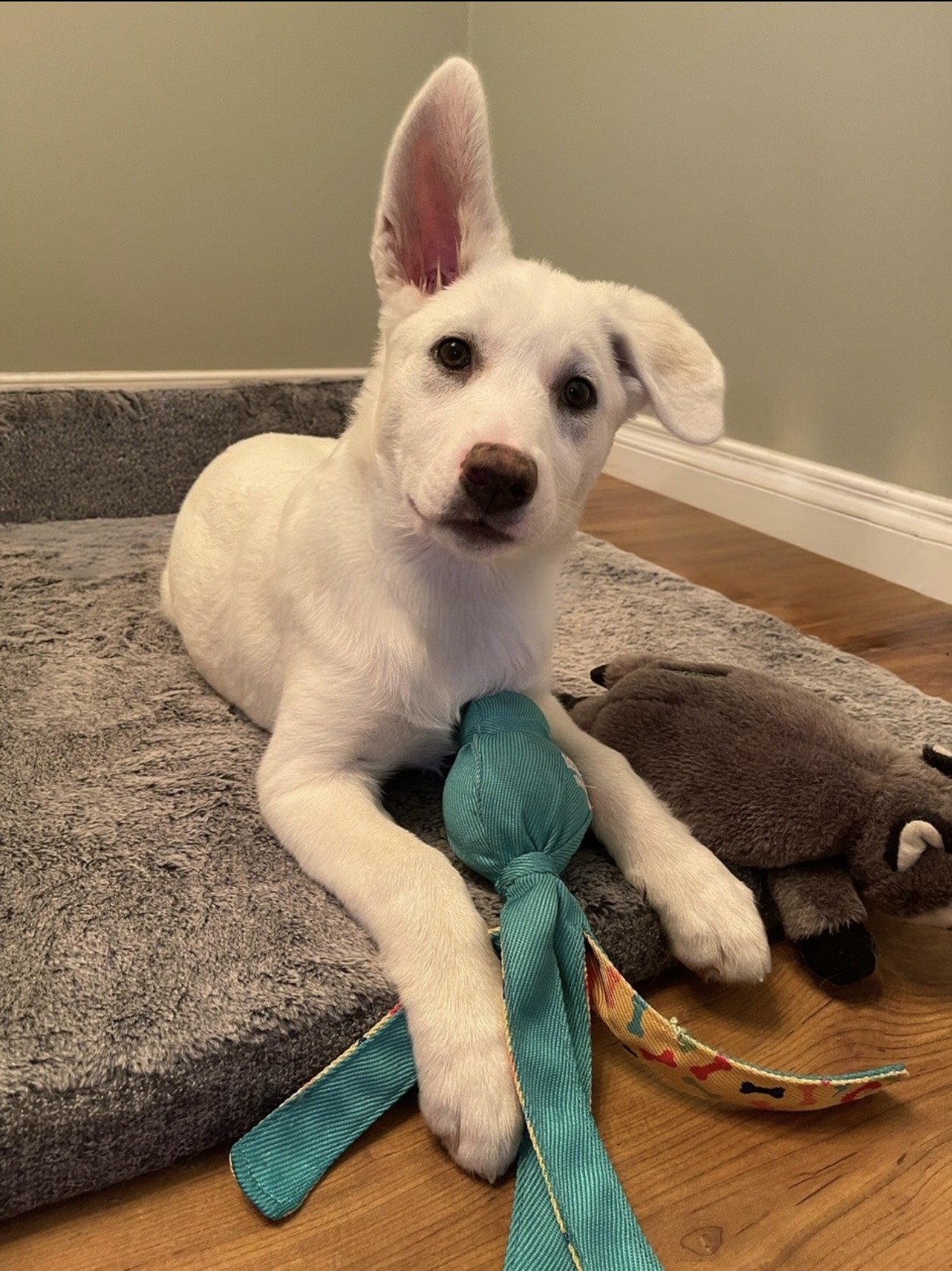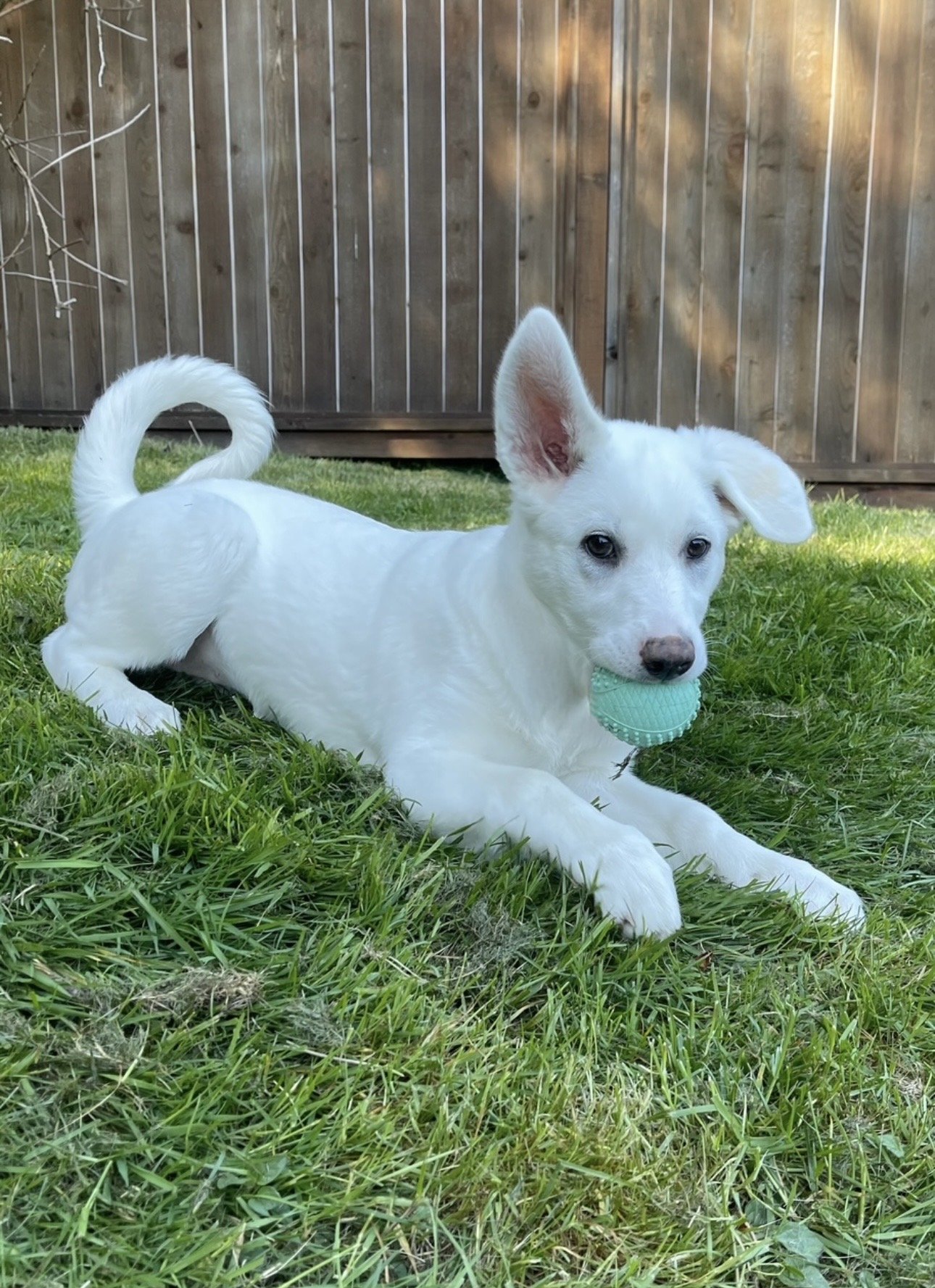 Foxy is the biggest of her litter. She has a very funny and playful energy. She is very independent. Went outside running around and will find places just to curl up and rest. But she will also curl up in your lap or beside you and snuggle lots. She’s mostly house trained and pee pad trained if inside too long. She has been around cats and other dogs and thinks she’s a big dog at times when she plays.