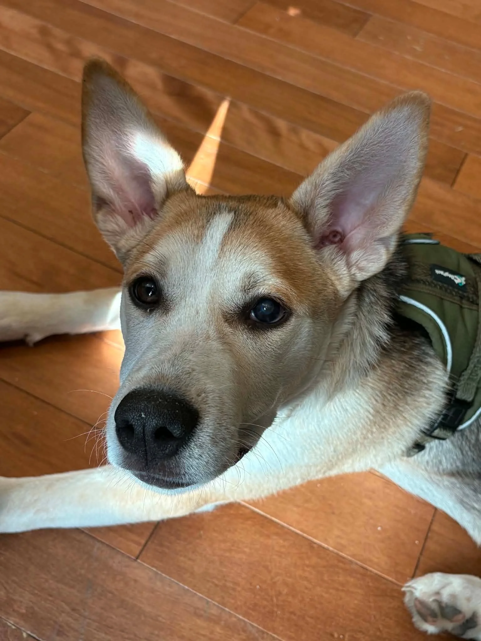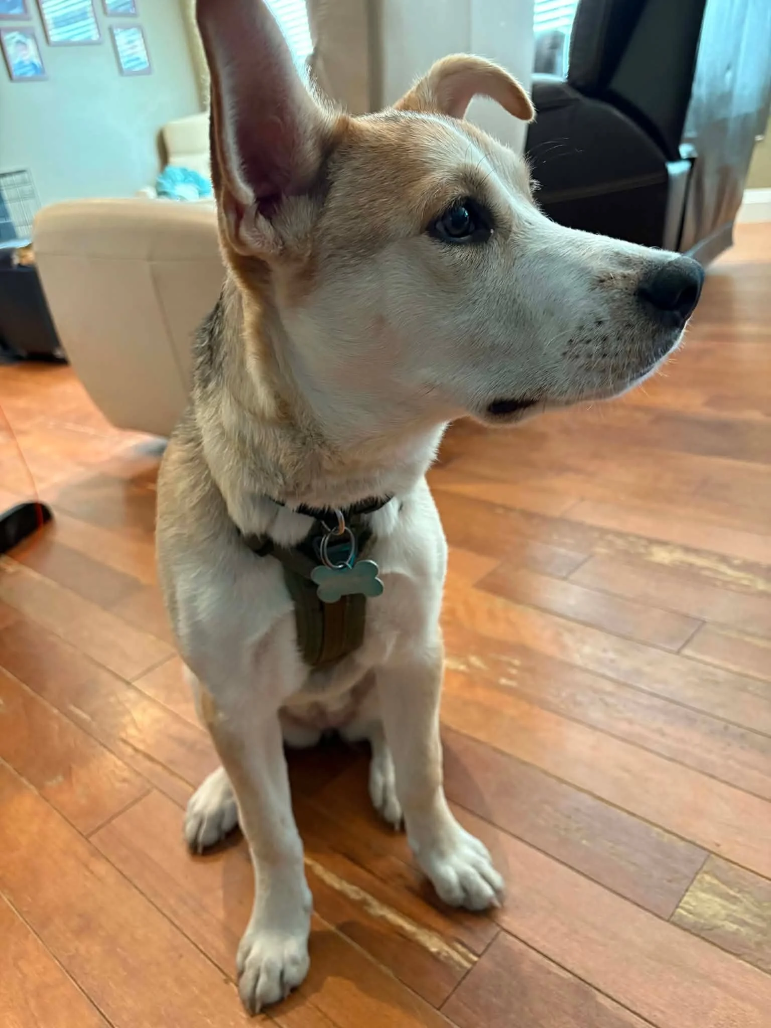 Golden enjoys yogurt treats, chasing her tail, playing with toys, and searching for bugs in the backyard. She may need a short warm-up in new situations, but once she’s comfortable, her fun, curious personality shines.