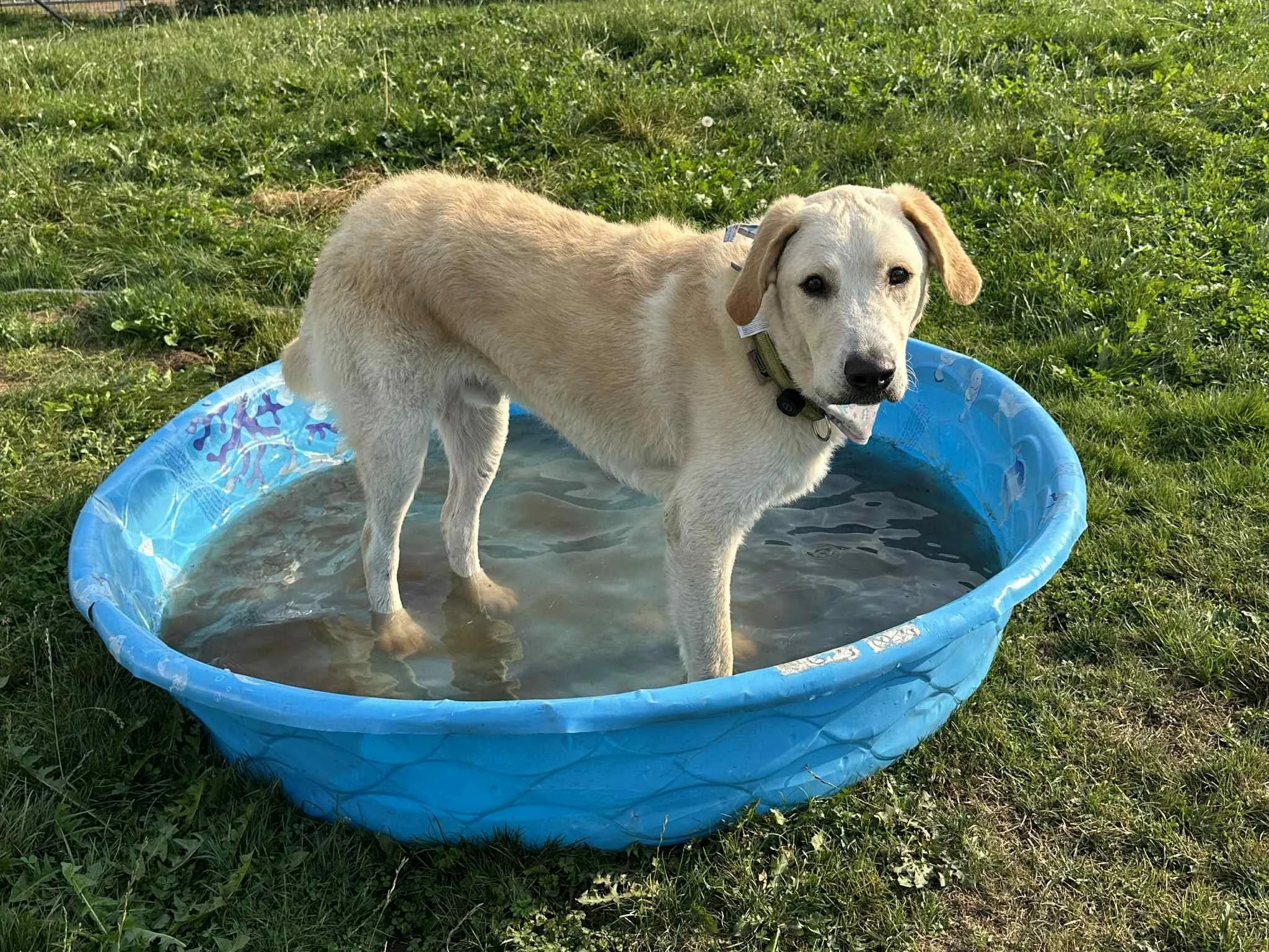 This little big boy, his name is Scottie He loves to play tug a war, fetch, and follow the leader! He does very well with other dogs and is learning his manners and personal space with the other dogs. He has found the pool and loves the water !! Scottie loves the big yard we have at the farm and would do very well on an acreage or a farm! He is learning to leave the cats alone indoors but outside if they start running, he proceeds to follow them! He is a very sweet boy… He sits by your feet when you’re resting or watching TV and follows you wherever you go so he doesn’t miss anything!!