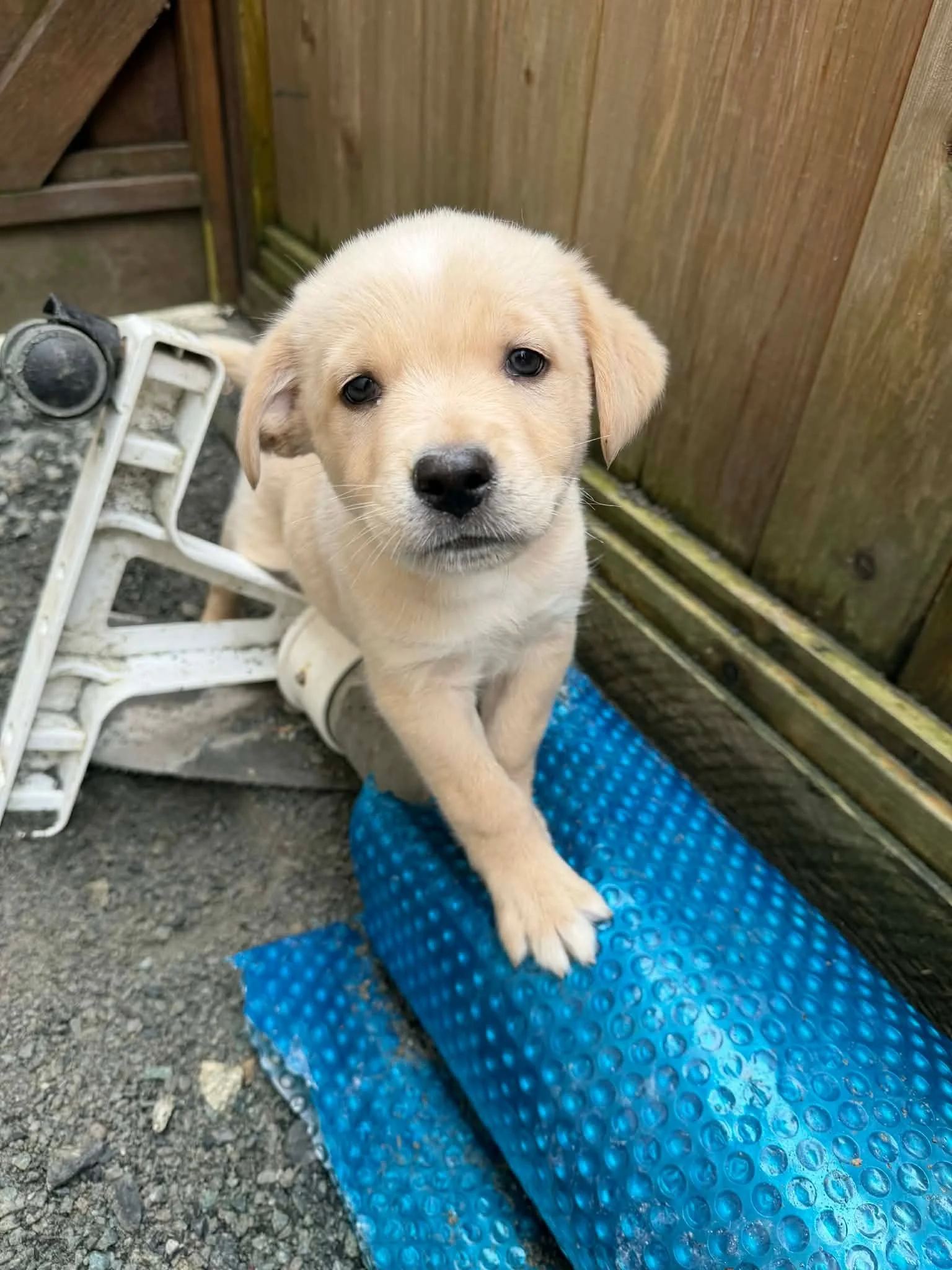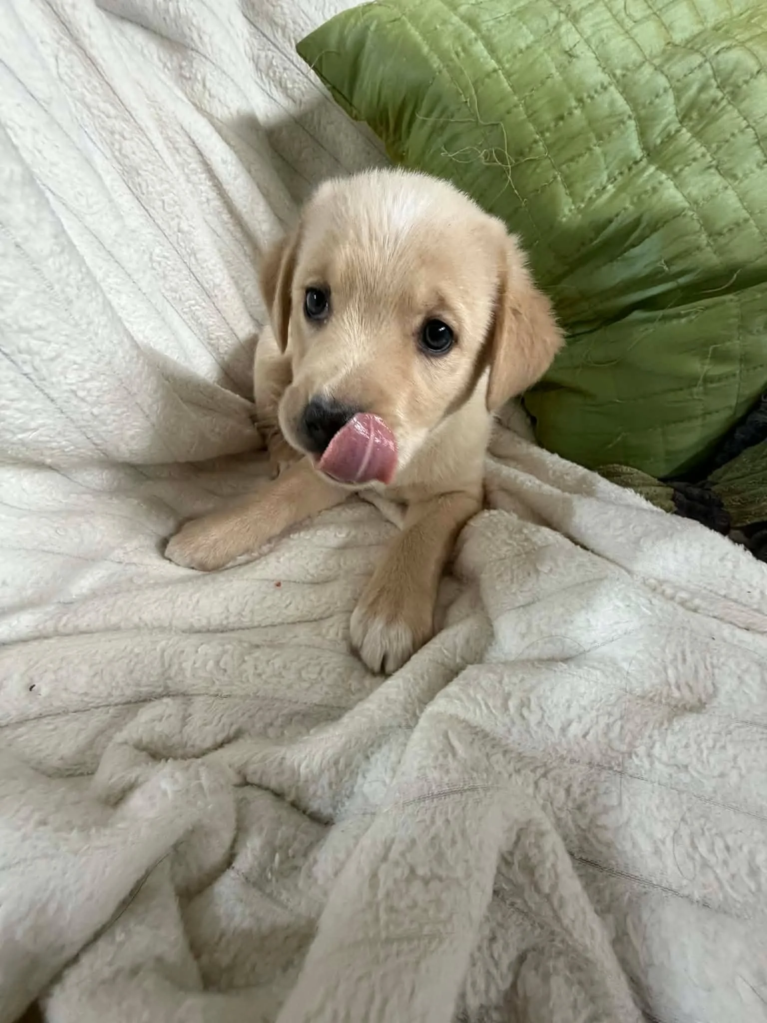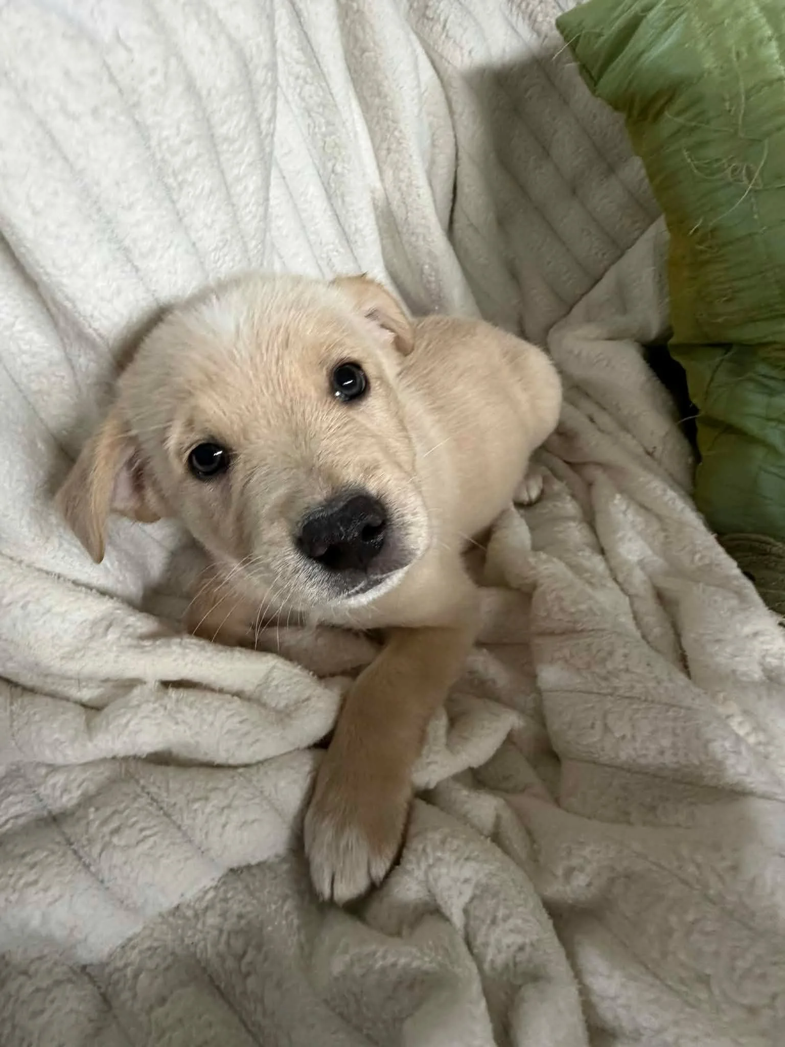 One of Lady’s pups, Tater loves attention and snuggles but gets wiggly when he wants to rejoin his siblings and continue playing. He is still very young so all his wonderful personality traits have yet to reveal themselves. He is very good about using the pee pads and retires to his crate when it’s time to sleep. A loving little boy looking for his forever home.