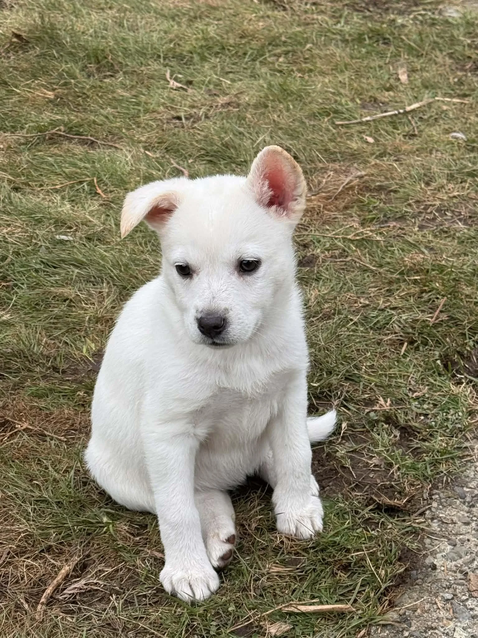 Winter is a sweet and playful little girl. She bounces around the yard and wants to play with all her puppy friends. She is sweet and cuddly and loves to give kisses. She has lots of energy when she plays and then settles down and sleeps. She will melt hearts every where she goes. She has been socializing and loves people. She has been around cats. She is still working on house training but knows to use pee pads if she is indoors.