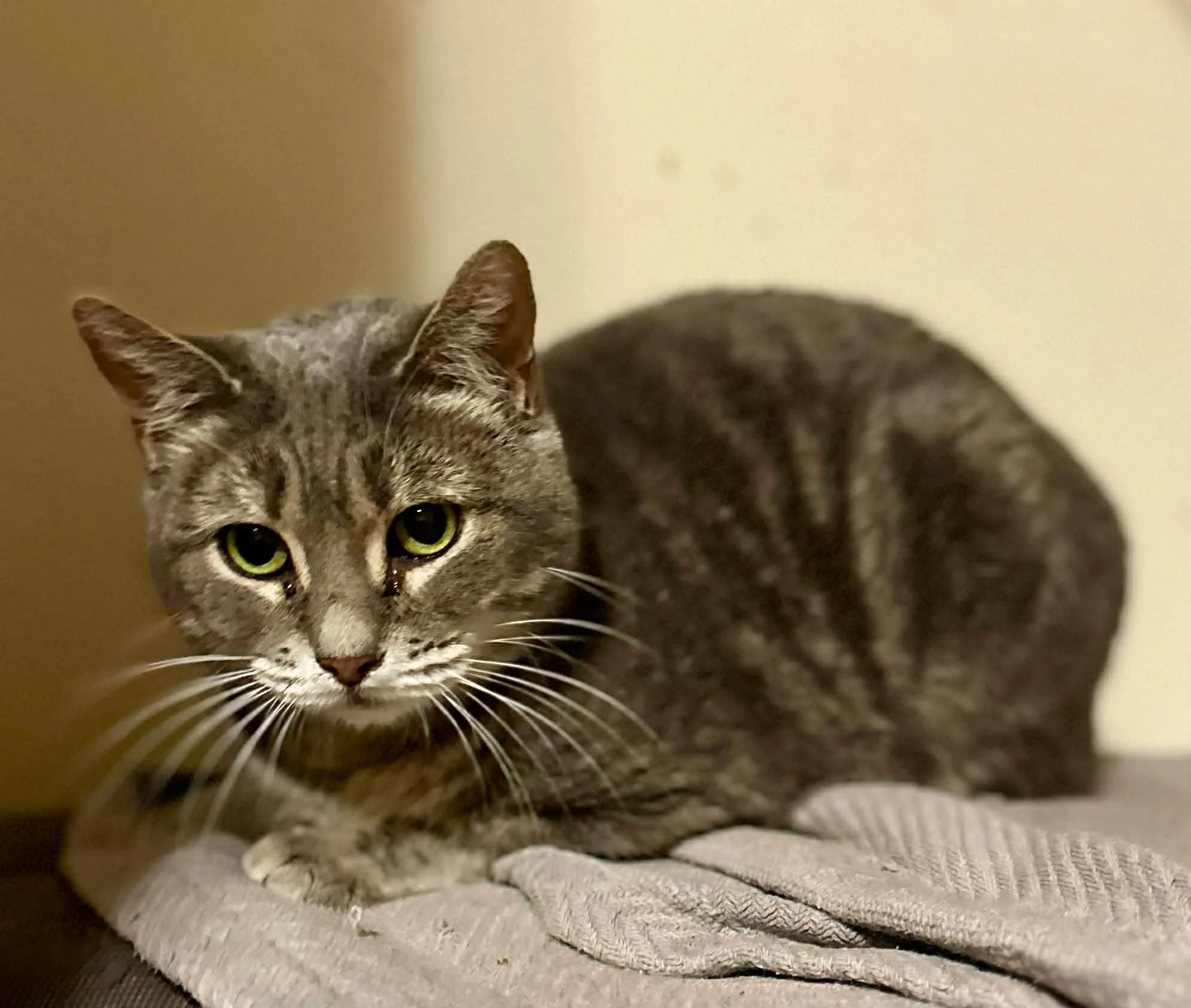 Sweet Potato has a chronic little “wheeze” from her rough start in life. You may notice it when she breathes, and it can temporarily become more noticeable during moments of stress, but it eases once she is calm again. This is her normal and it has had no impact on her overall health and requires no treatment.